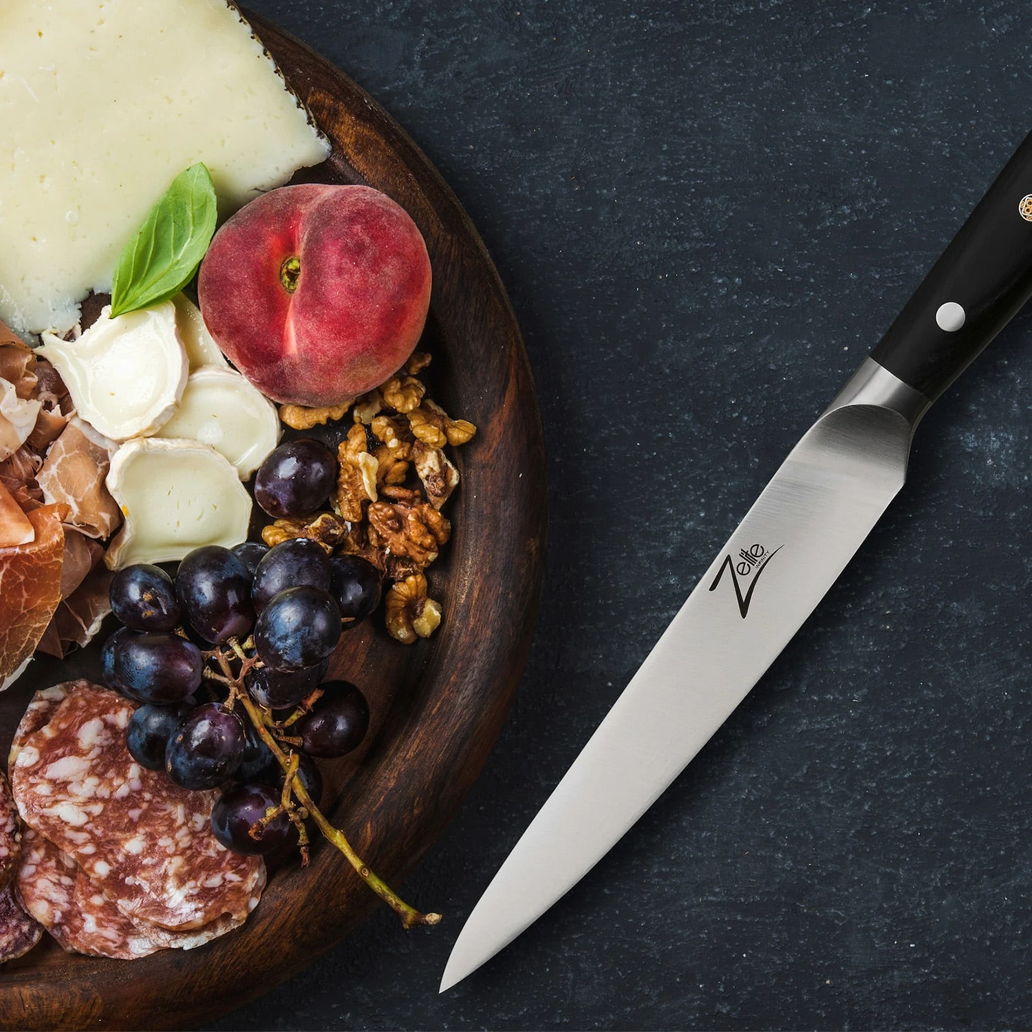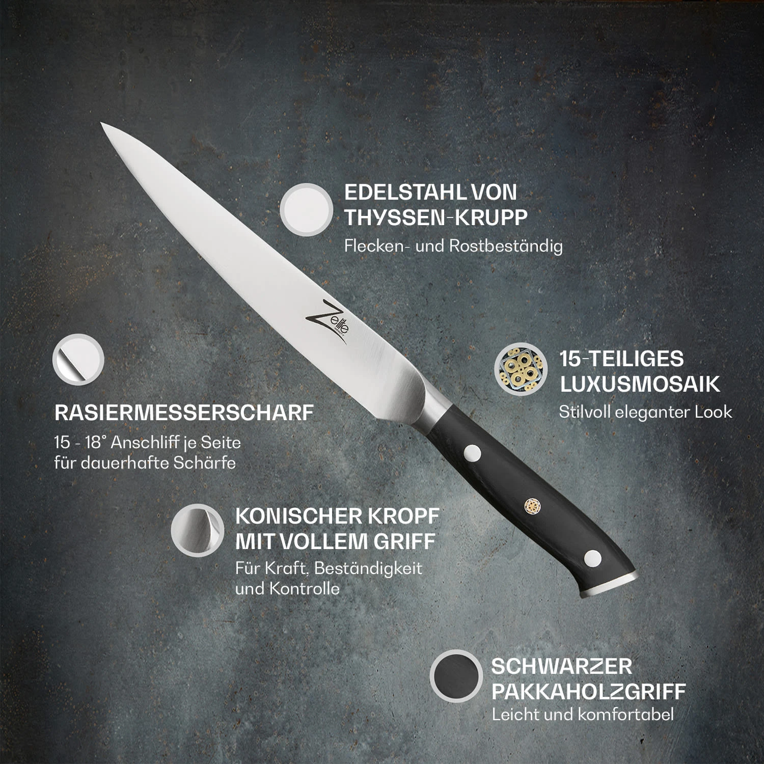 Das 6″ Küchenmesser ist aus deutschem Qualitäts-Edelstahl von Thyssenkrupp und schwarzem Pakkaholz gefertigt. Der ergonomische, dreifach vernietete Griff ist mit einer Mosaikniete versehen und liegt beim Schneiden gut und sicher in der Hand. Das 6″ Allzweckmesser von Zelite Infinity by Klarstein ist ein echter Alleskönner – vom Filetieren von Fleisch und Fisch über Schneiden von Gemüse und Obst bis hin zum Hacken von Kräutern und Nüssen – und damit ein unverzichtbarer Helfer in deiner Küche.