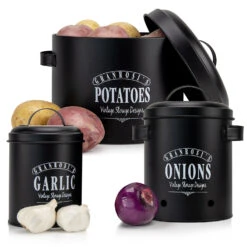 Die Georgia Vintage-Vorratsbehälter verleihen deiner Küche das gewisse Etwas und sind eine Bereicherung für jeden Haushalt: Bestehend aus insgesamt 3 x Klarstein Vorratsdosen für Knoblauch (12 x 18 cm (ØxH)), Zwiebeln (17 x 22,5 x 14 cm (BxHxT)) und Kartoffeln (27 x 21 x 23,5 cm (BxHxT)).