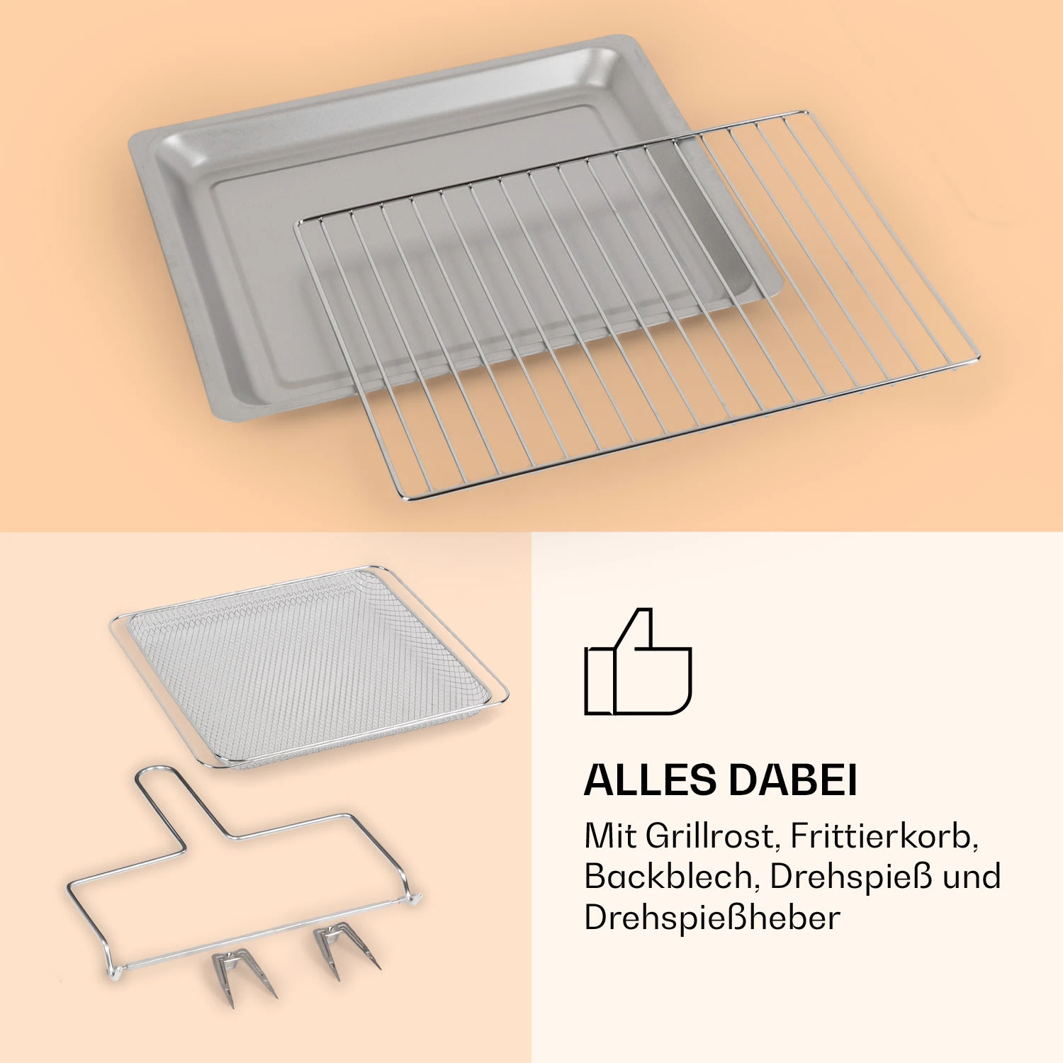 - Zubehörset: Grillrost, Frittierkorb, Backblech, Drehspieß und Drehspießgriff